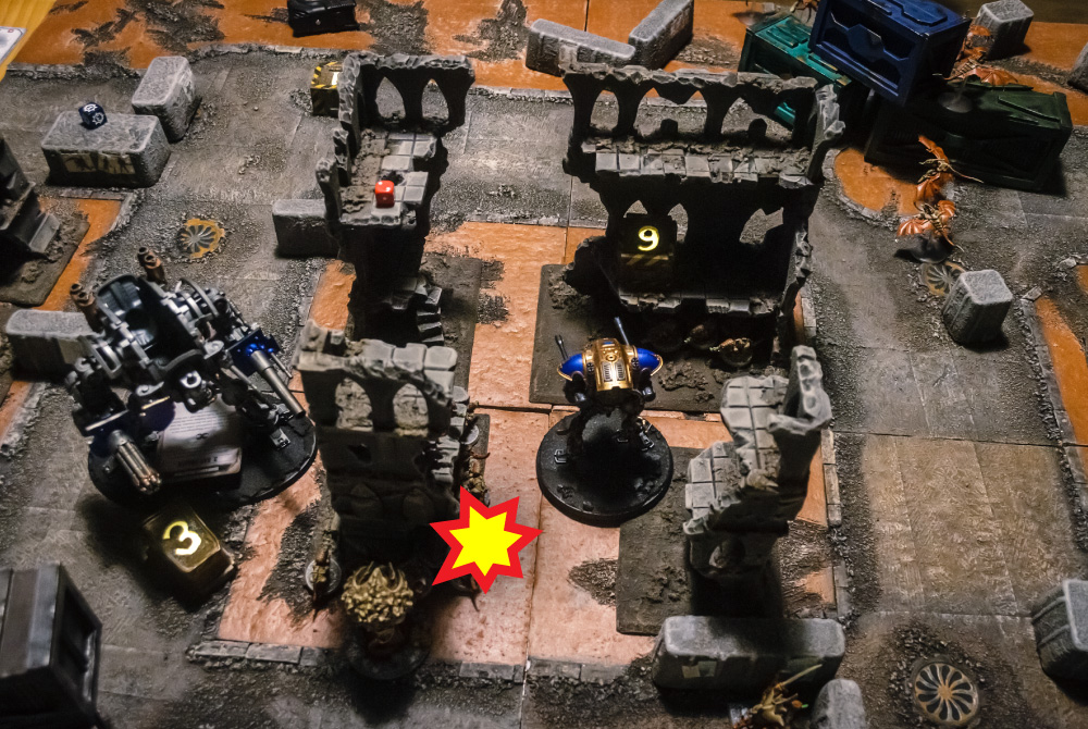• Die Battlecannon trifft den Tyraniden-Warlord, das Warpfeld schirmt ihn erneut vom Schaden ab