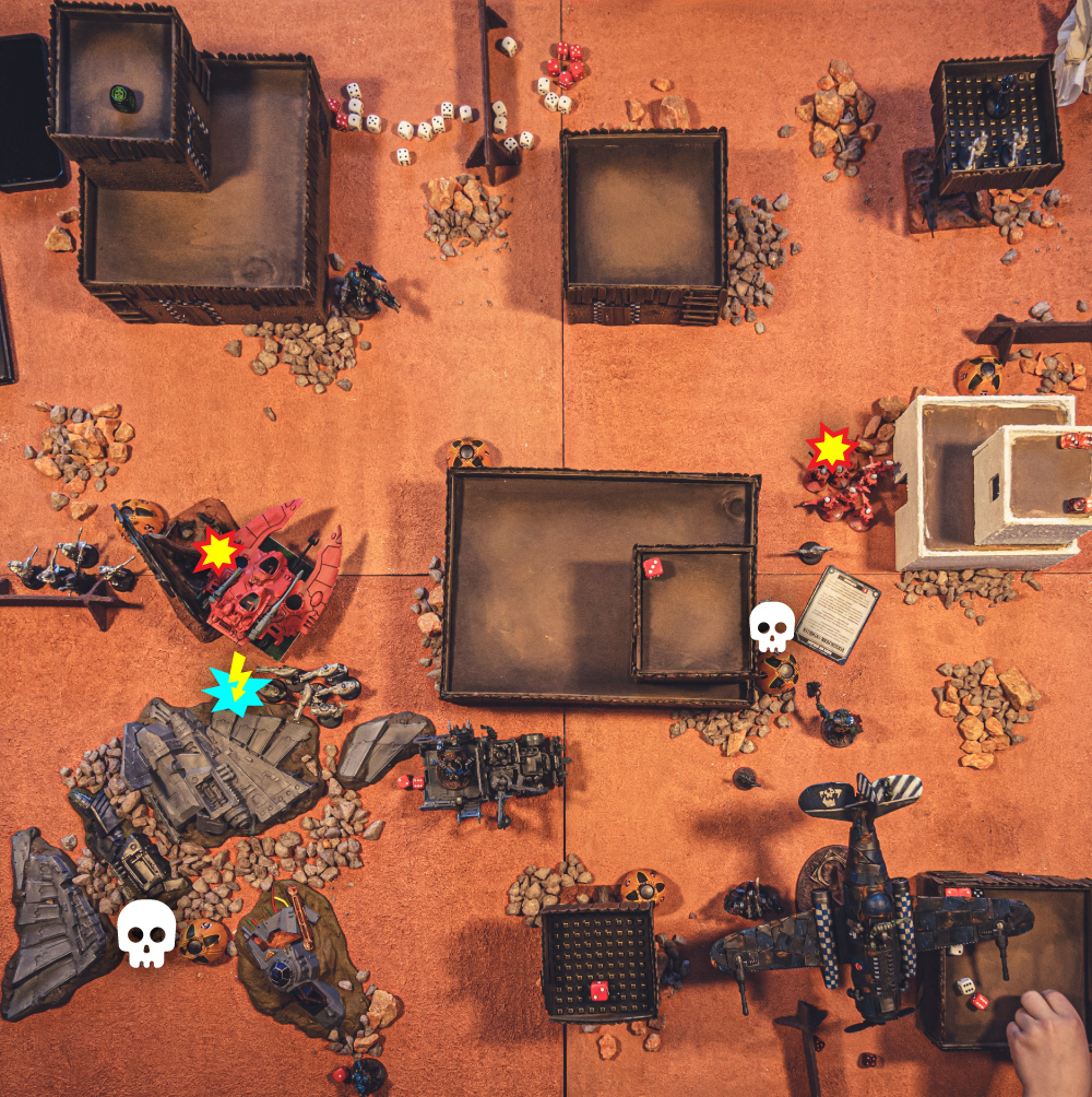 • Der Trukk mit Thraka und der Battlewagon von Blitzfaust werden von den Wave Serpents und den Dark Reapers beschädigt