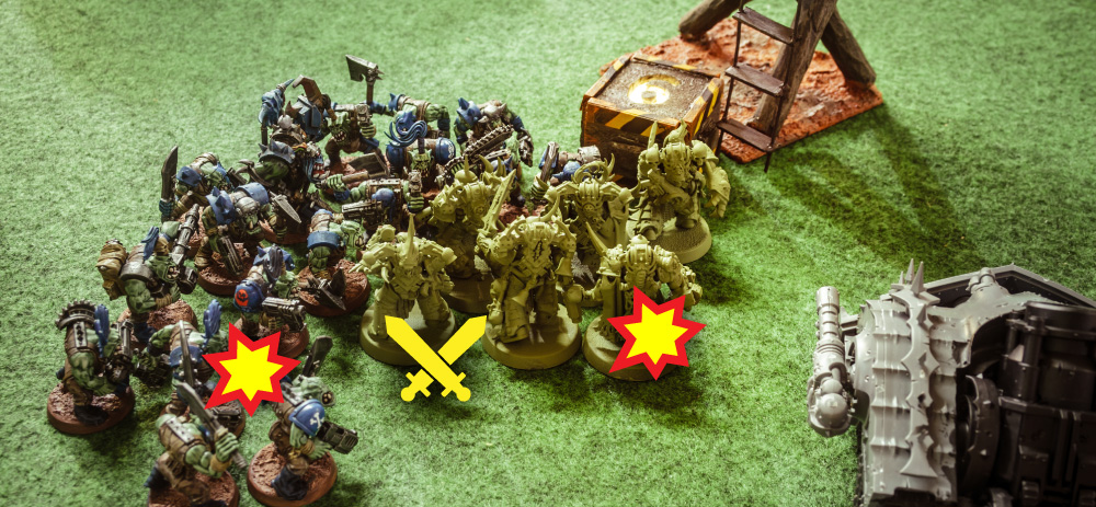 • Die Plague Marines dezimieren die Boyz im Nahkampf, verlieren aber ebenfalls zwei Kämpfer.