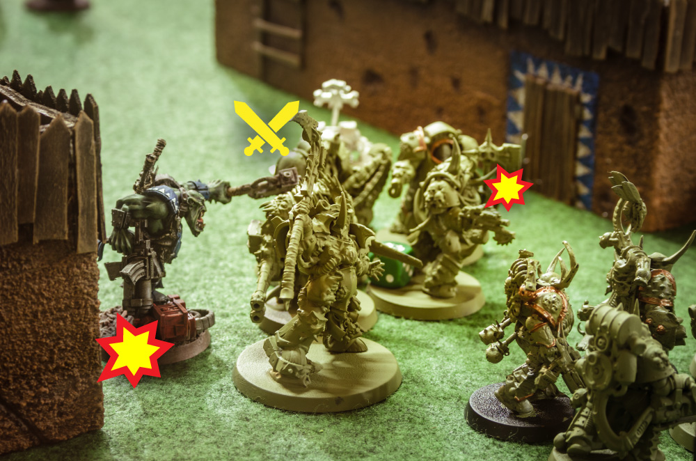 • Der BigMek, der Painboy und der letzte Grot attackieren die Plague Marines.